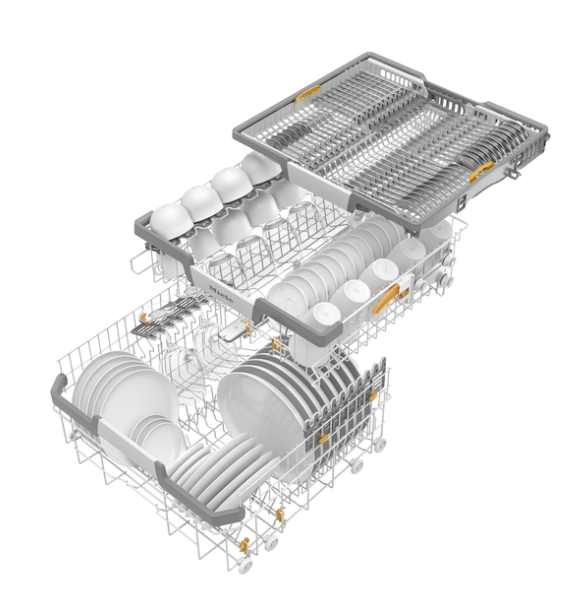 Nu kan du også anbringe små servicedele som espressokopper på bestikbakken i din opvaskemaskine. 3D MultiFlex-bakken består af en sænket midterdel og to sidepaneler. Det venstre panel kan skubbes til højre for at gøre plads til langstilkede vinglas i overkurven. I den sænkede del kan du nemt placere stort bestik og små servicedele.